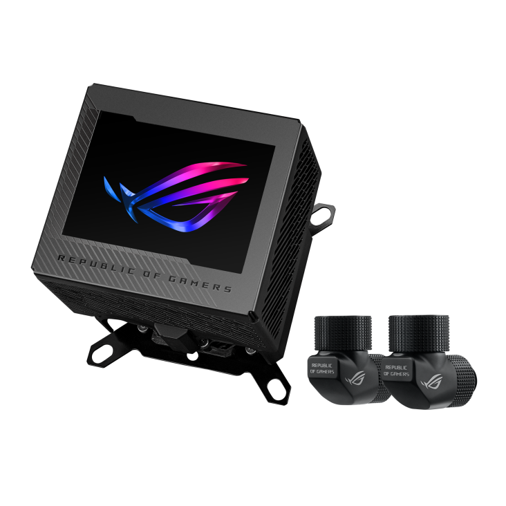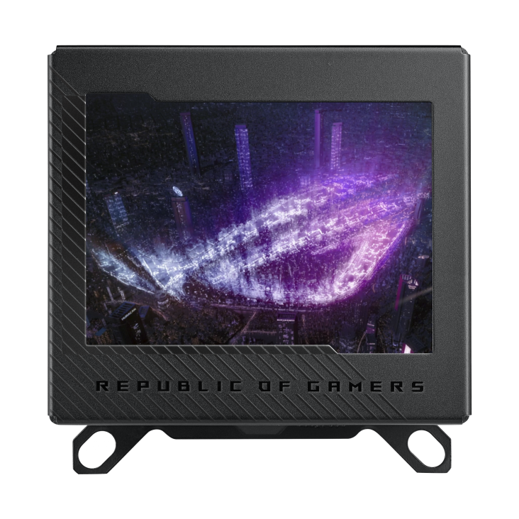 בלוק מים איכותי מבית Asus, ללא רדיאטור ומשאבה. הכולל מסך LCD המציג תמונות ומידע על המערכת.