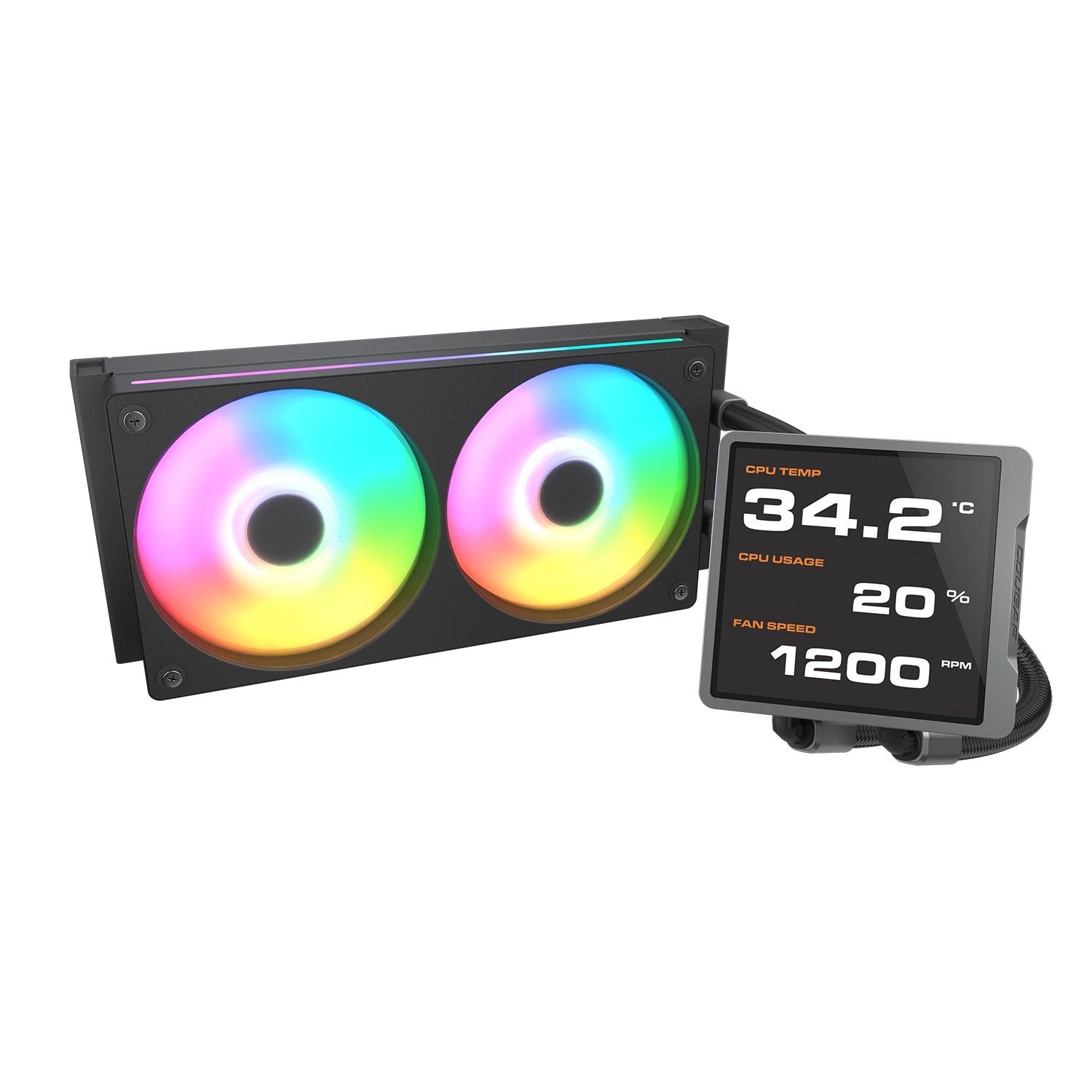 קירור נוזלי למעבד מבית Cougar, רדיאטור של 240mm הכולל 2 מאוררים של 120mm ARGB, כולל מסך LCD מותאם אישית המציג קובצי GIF, תמונות ומידע על המערכת.